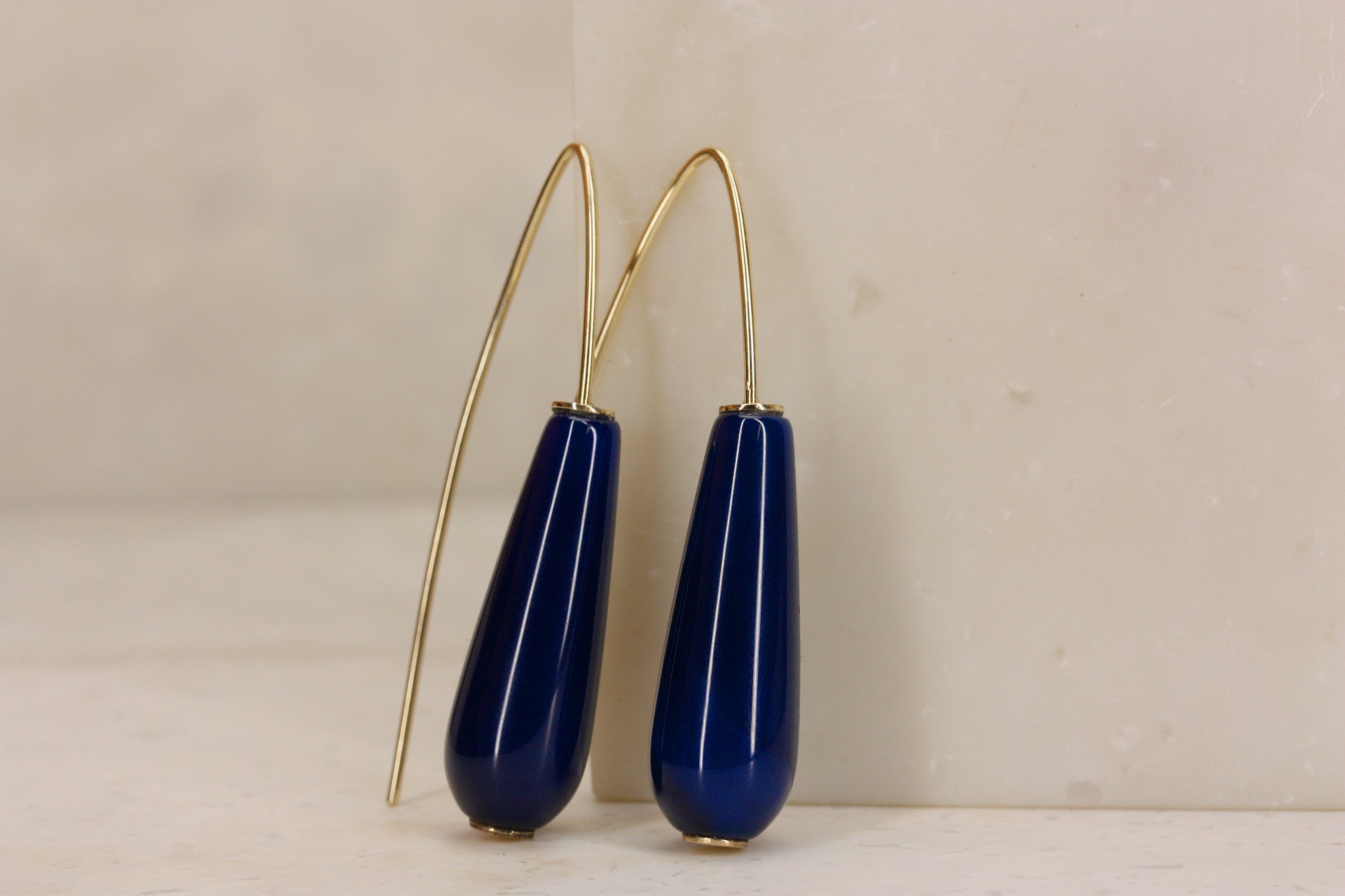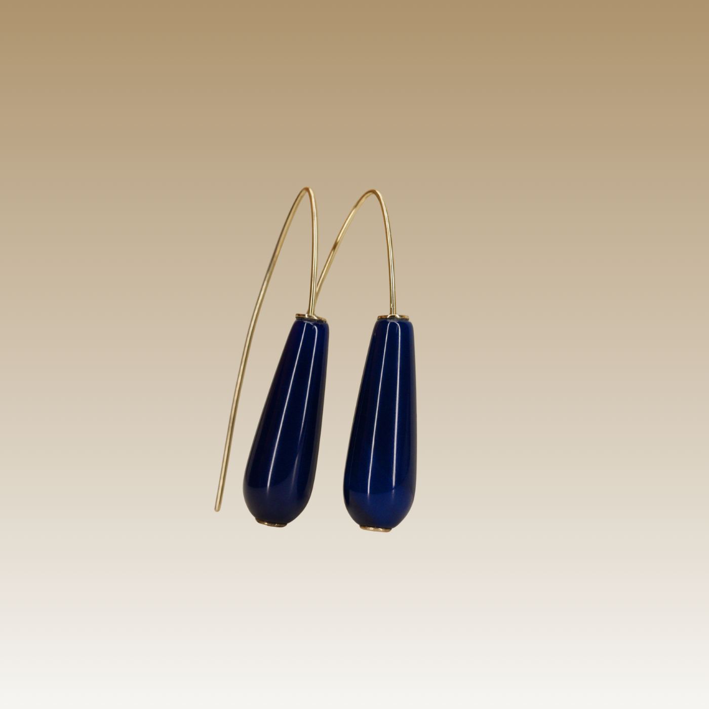 Oorhaken in 14 krt geelgoud met blauwe agaat, 10x30mm.