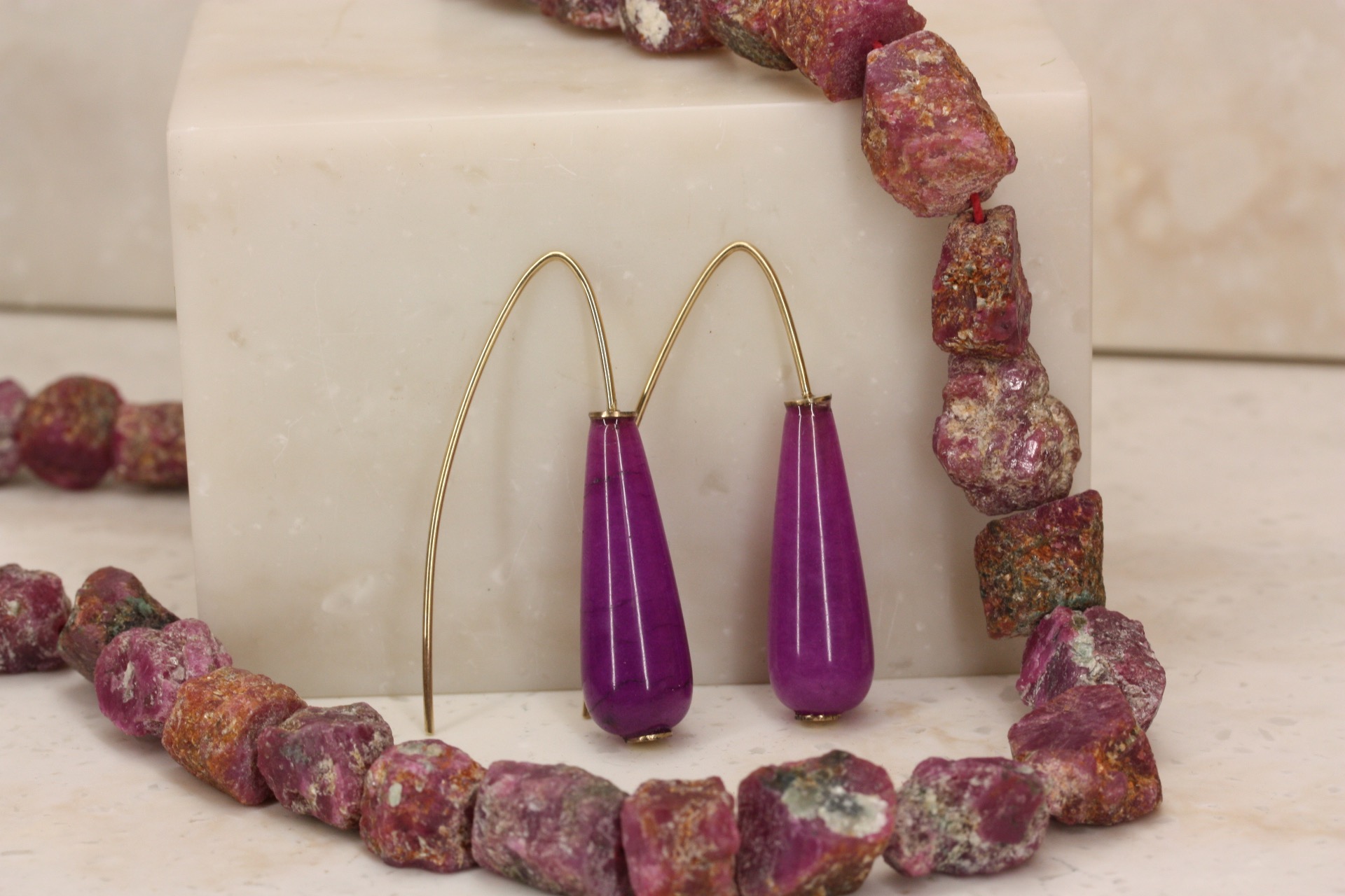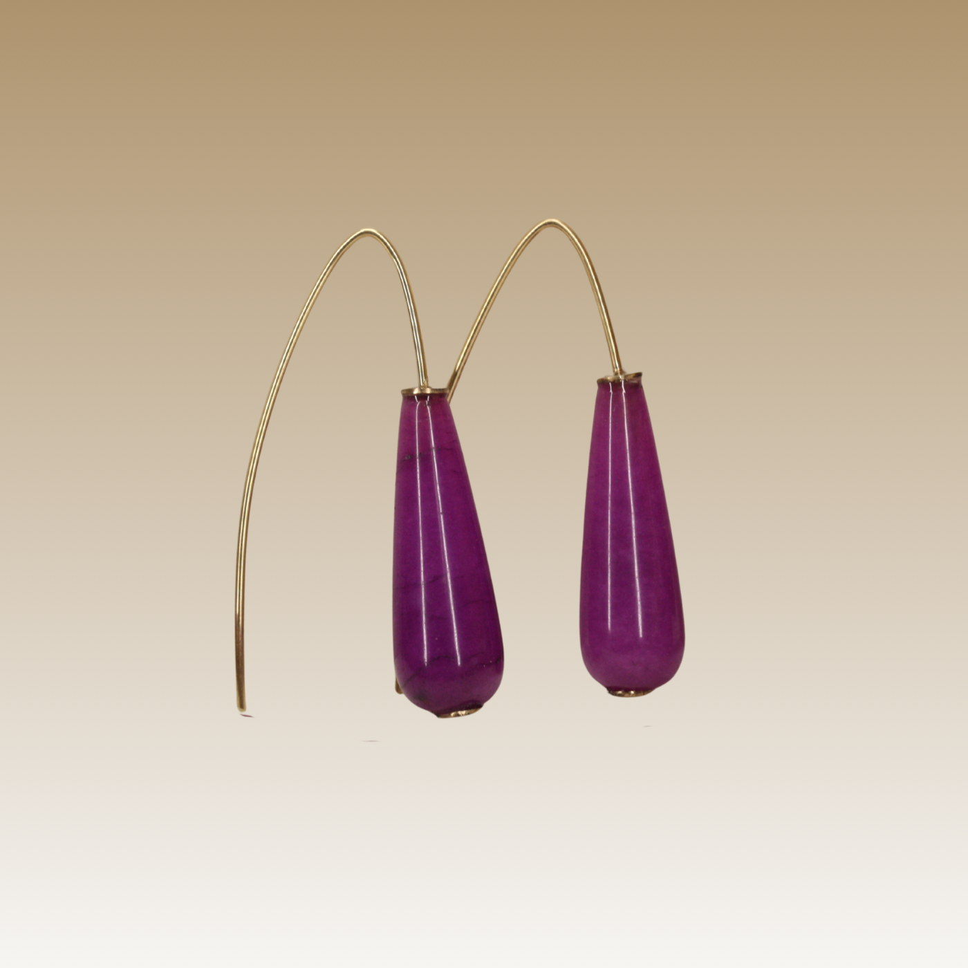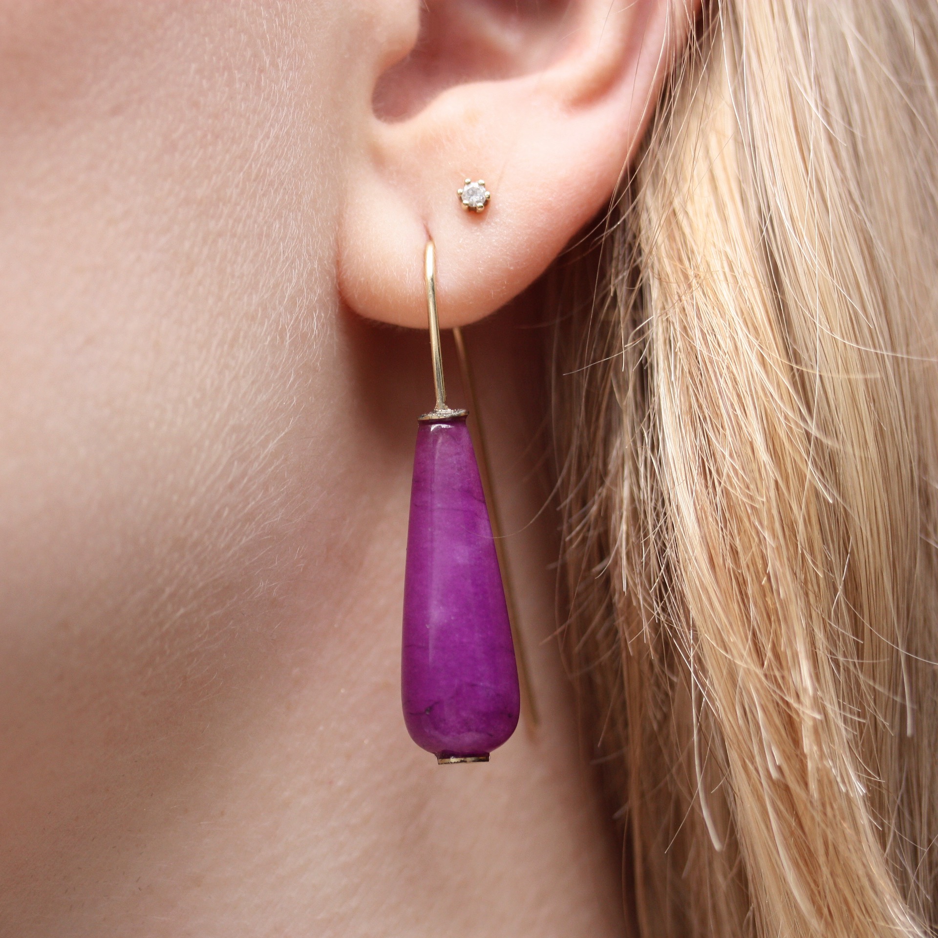 Oorhaken in 14 krt geelgoud met jade in fuchsia, 10x30 mm.