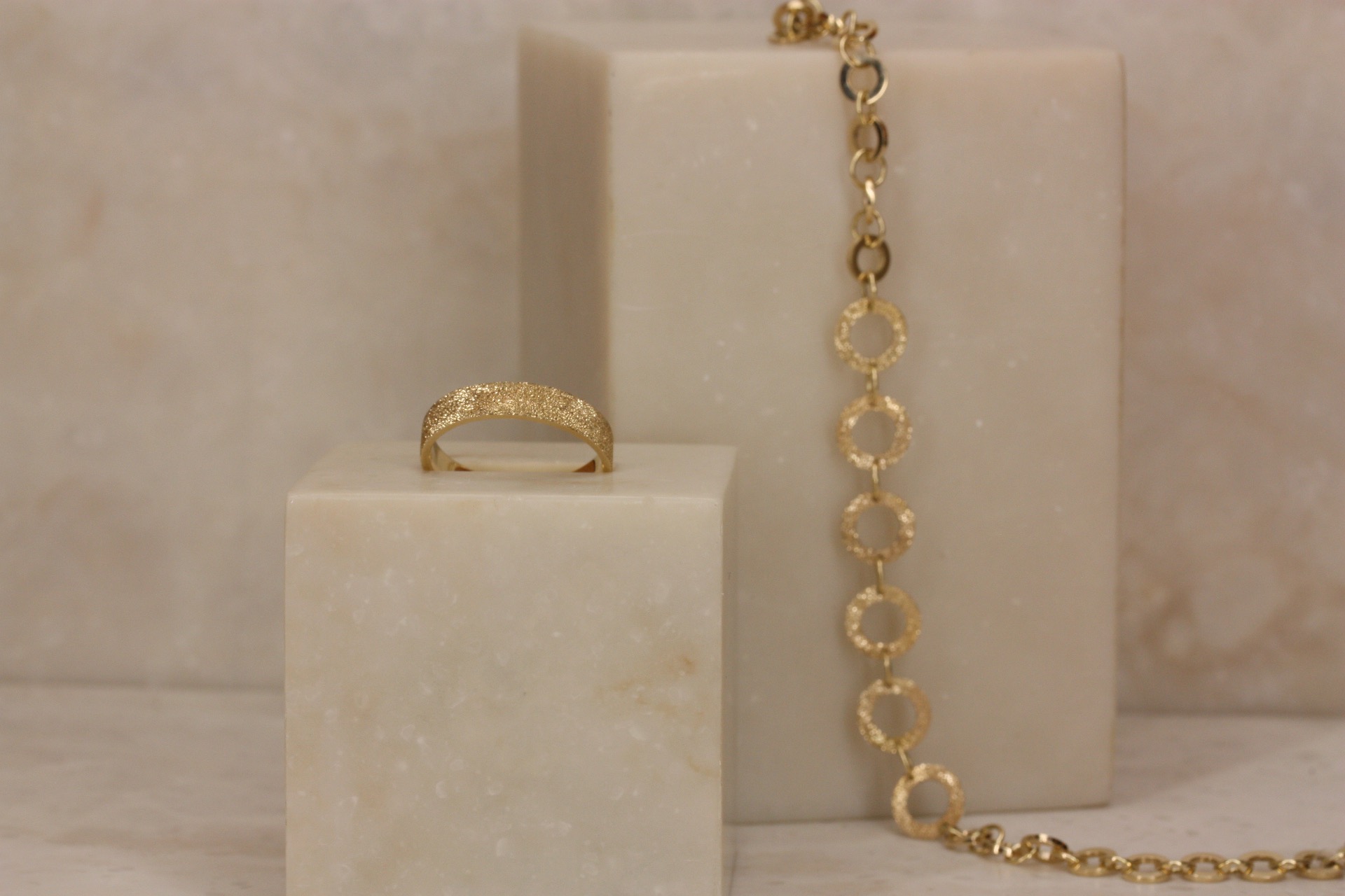Ring in 14 krt geelgoud in gediamanteerde structuur.